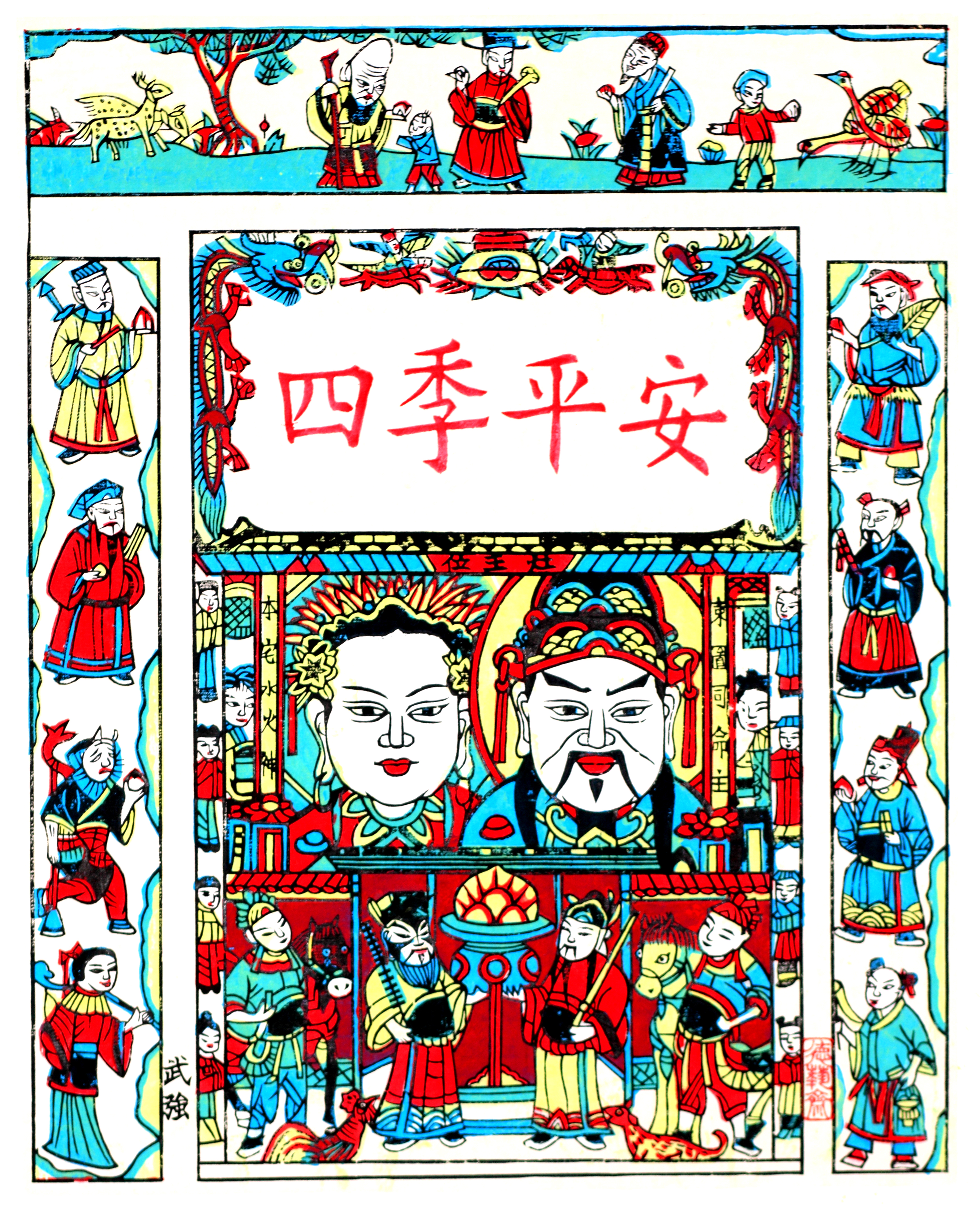Lunar Year Pictures (年画Nián Huà) is a Chinese folk painting, which is often displayed inside a residential house or at the gate during the Spring Festival. The production method is usually wood engraving and then rubbing and coloring, but some are just hand-painted. It carries stories from generation to generation for thousands of years, especially stories about Chinese Gods for generations.